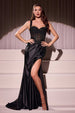 This fit-and-flare gown by Ladivine CD775 combines elegance and allure with its sweetheart neckline, delicate straps, and sheer bodice adorned with intricate lace applique and crystal beading. The soft stretch satin hugs the figure, complemented by a pleated back hip and a graceful leg slit for added drama. Perfect for black tie events, galas, or prom, this dress is a statement of refined sophistication.