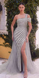 Andrea & Leo A1314 Long One Shoulder Silver Beaded Gown Leg Slit