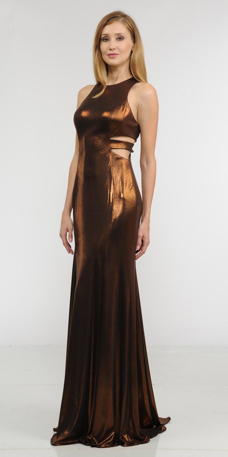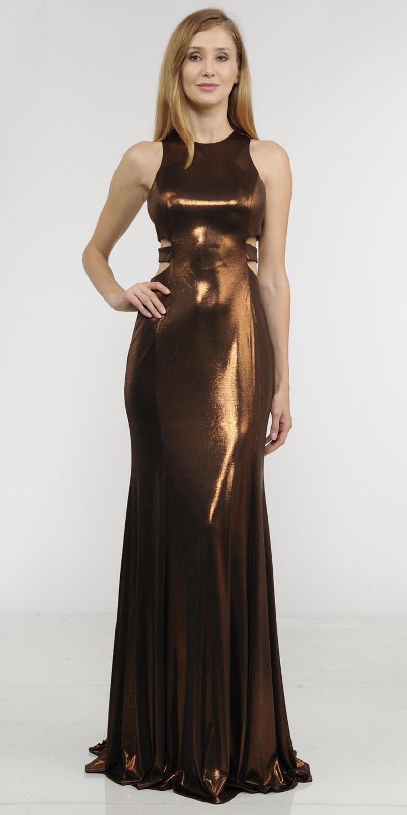Brown Metallic Foil Sleeveless Long Formal Dress with Side Cut-Outs