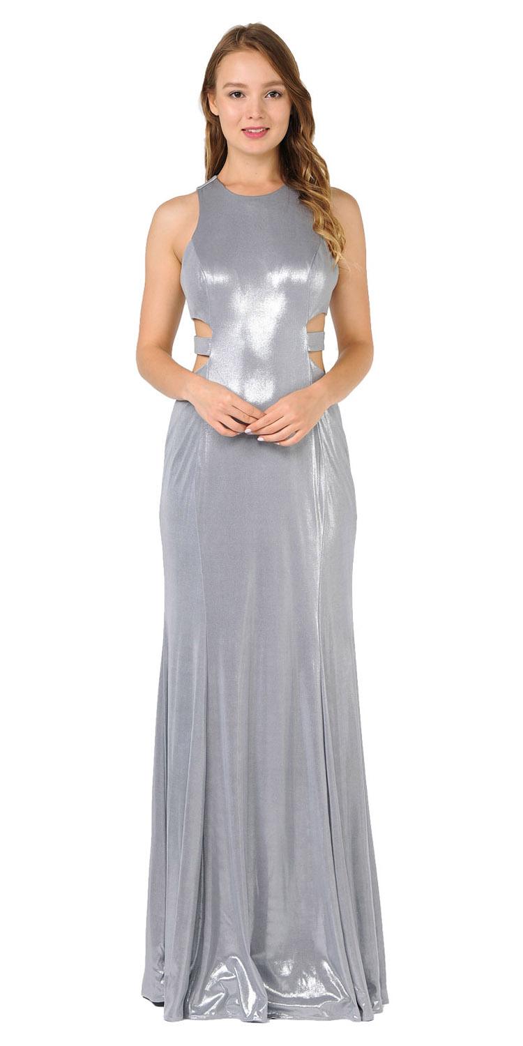 Silver Metallic Foil Sleeveless Long Formal Dress with Side Cut-Outs