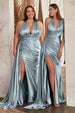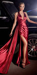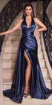 Ladivine CH079 Floor Length Fitted Halter Satin Gown Leg Slit Side Sash