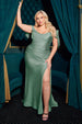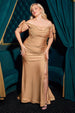Imagine yourself wearing this stylish long formal stretch luxe jersey gown for your next special event! This sheath floor length formal dress by Ladivine CD943C has an off the shoulder strap and is artfully tucked and ruched to accentuate your curves. This dress features an off the shoulder neckline framed by elongated ties and a floor pooling fishtail hem, which is defined by a dramatic front leg slit. Part of the BrideMuse collection. An ideal full length formal dress for red carpet events, pageant, prom or in any other formal occasions!