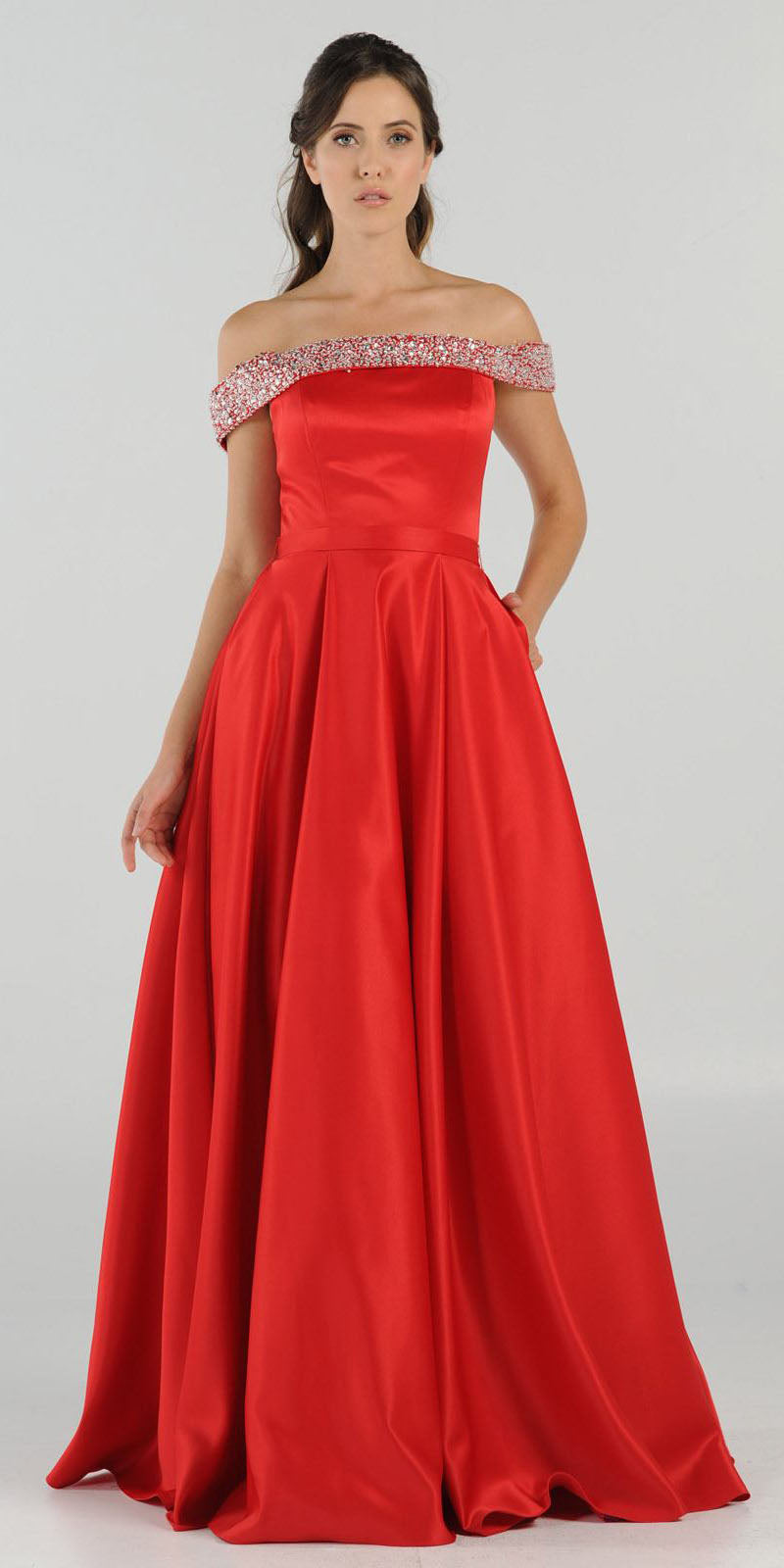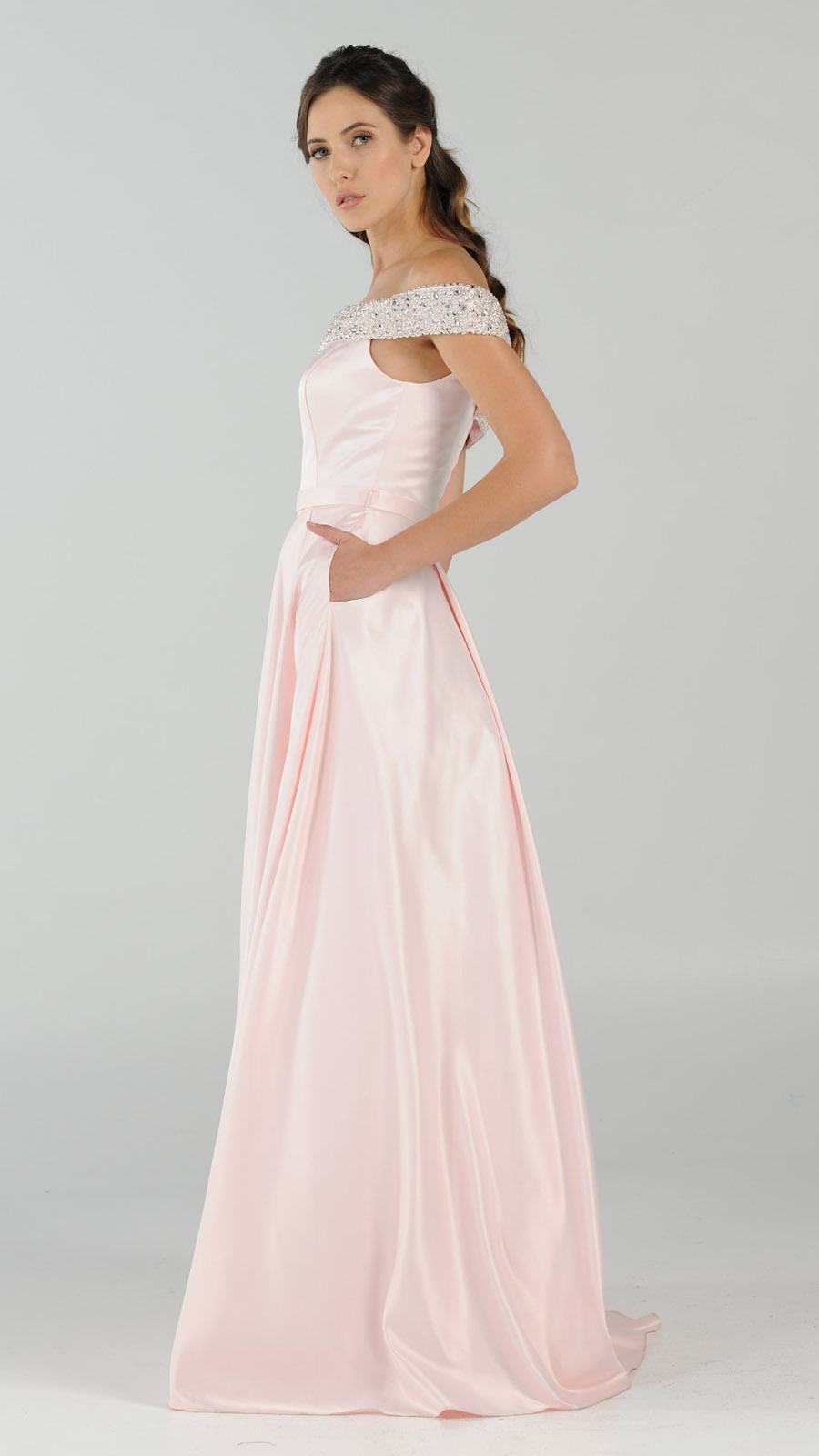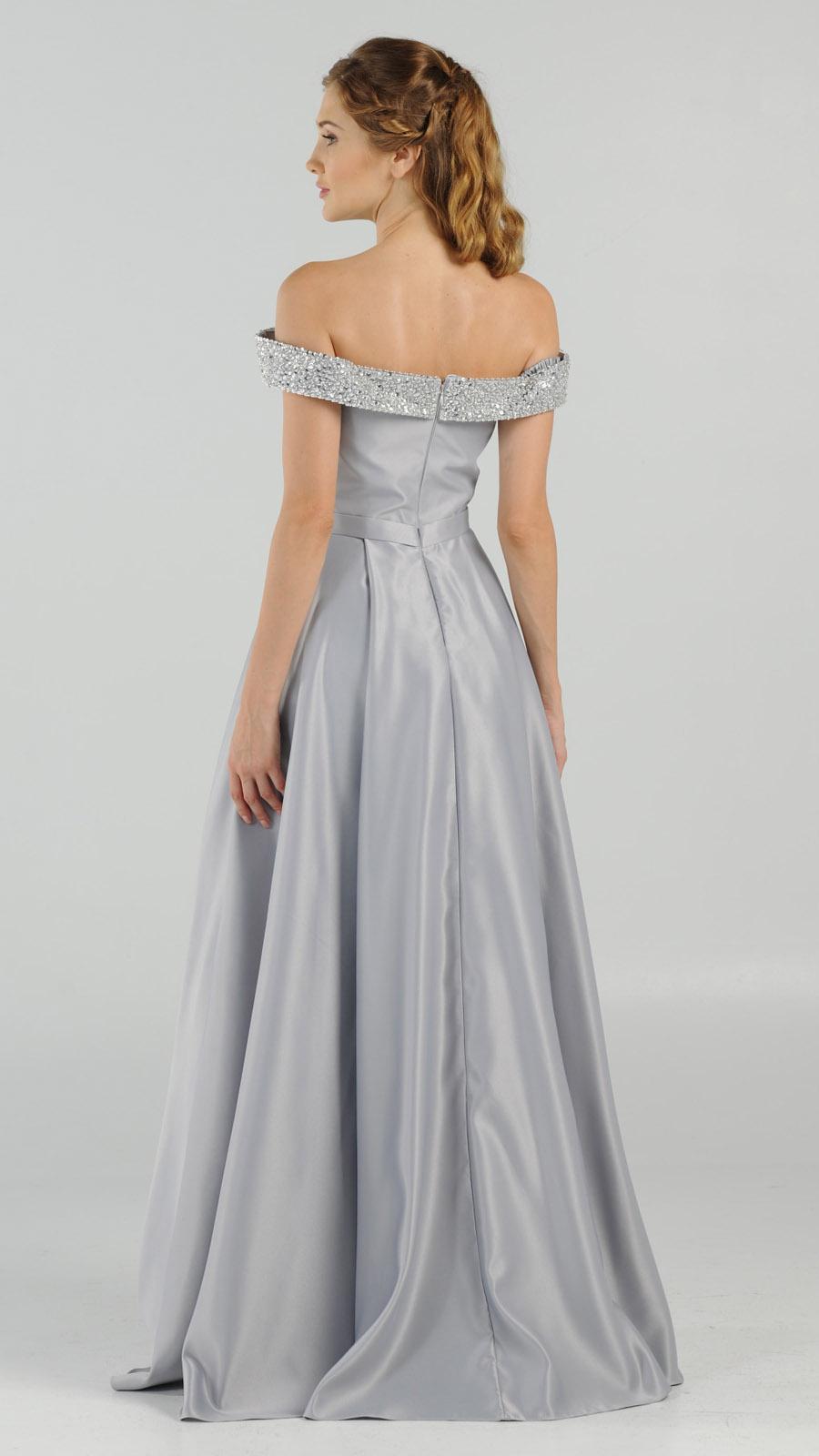 Be confidently beautiful wearing this trendy off-the-shoulder style long prom dress by Poly USA | Ed Young 8242 in silver. A stunning formal dress with pockets, a rhinestones embellished wide band wrap around the arms forming the off-the-shoulder style and a timeless neckline. You will definitely enjoy the celebrations with this classic a-line dress with full of refinement and elegance.