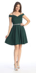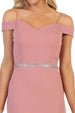 Step into this beautiful knee length dress by Celavie 6395-S. This short A-line dress features a cold shoulder design with beading around the waistline.