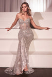 This fitted dress by Ladivine CC398 features a strapless V-neckline with a sheer bodice adorned in a linear beaded motif, creating a striking, textured design. The sequin and bead embellishments shimmer with every movement, while the structured bodice offers enhanced support, secured with a lace-up corset back. Ideal for prom, black tie, or formal events, this gown exudes elegance and timeless appeal.