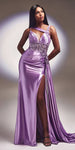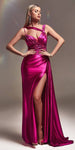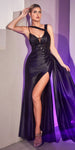 Cinderella Divine CDS415 Long Fitted Satin Gown with Lace Detail and Slit