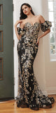 Ladivine J844 Strapless Glitter Floral Print Gown with Detachable Puff Sleeves