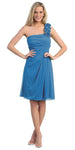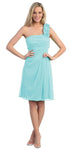 Discover the charm of simple and comfortable attires by wearing this beautiful A-line dress for a bridal party. This sleeveless dress in turquoise comes fashioned with a one shoulder design that includes exquisite flower rosette motifs clustered together on the single strap. Horizontal pleats define the fitted bodice and a straight neckline, while an empire waistline leads to a knee-length skirt. A sheer stole completes its look in an endearing manner.
