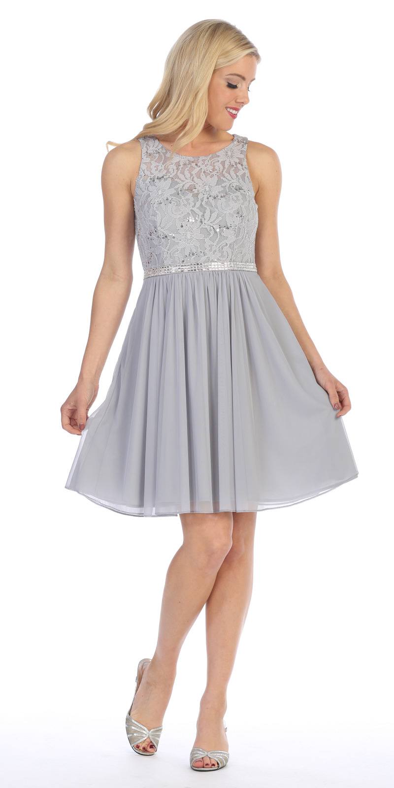 Slip into this A-line knee-length party dress by Celavie 6344s. A sleeveless short dress made of combined fabric, lace top and chiffon skirt adorned with thin glimmering waistband. Definitely a charming outfit for homecoming, wedding events, graduation or any other special celebrations.