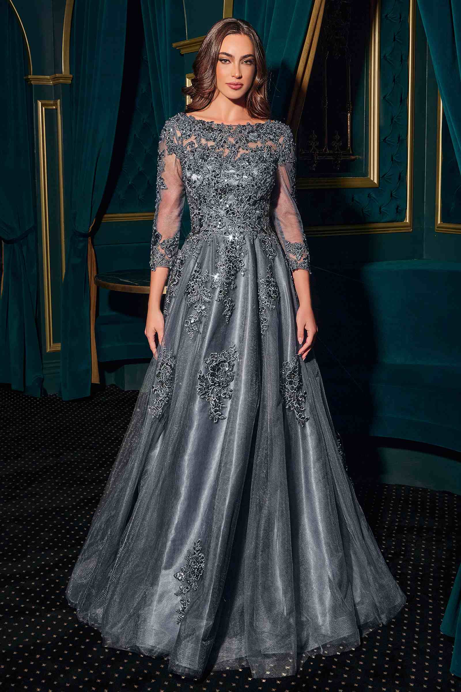 This elegant ball gown by Ladivine J883 features a refined high neckline, three-quarter sleeves, and a striking V-back for a graceful balance of coverage and allure. Crafted from delicate lace and layers of flowing tulle, the structured bodice enhances the waist while the voluminous skirt creates a timeless silhouette. Perfect for mothers of the bride or any formal event, it radiates classic sophistication with a modern touch.