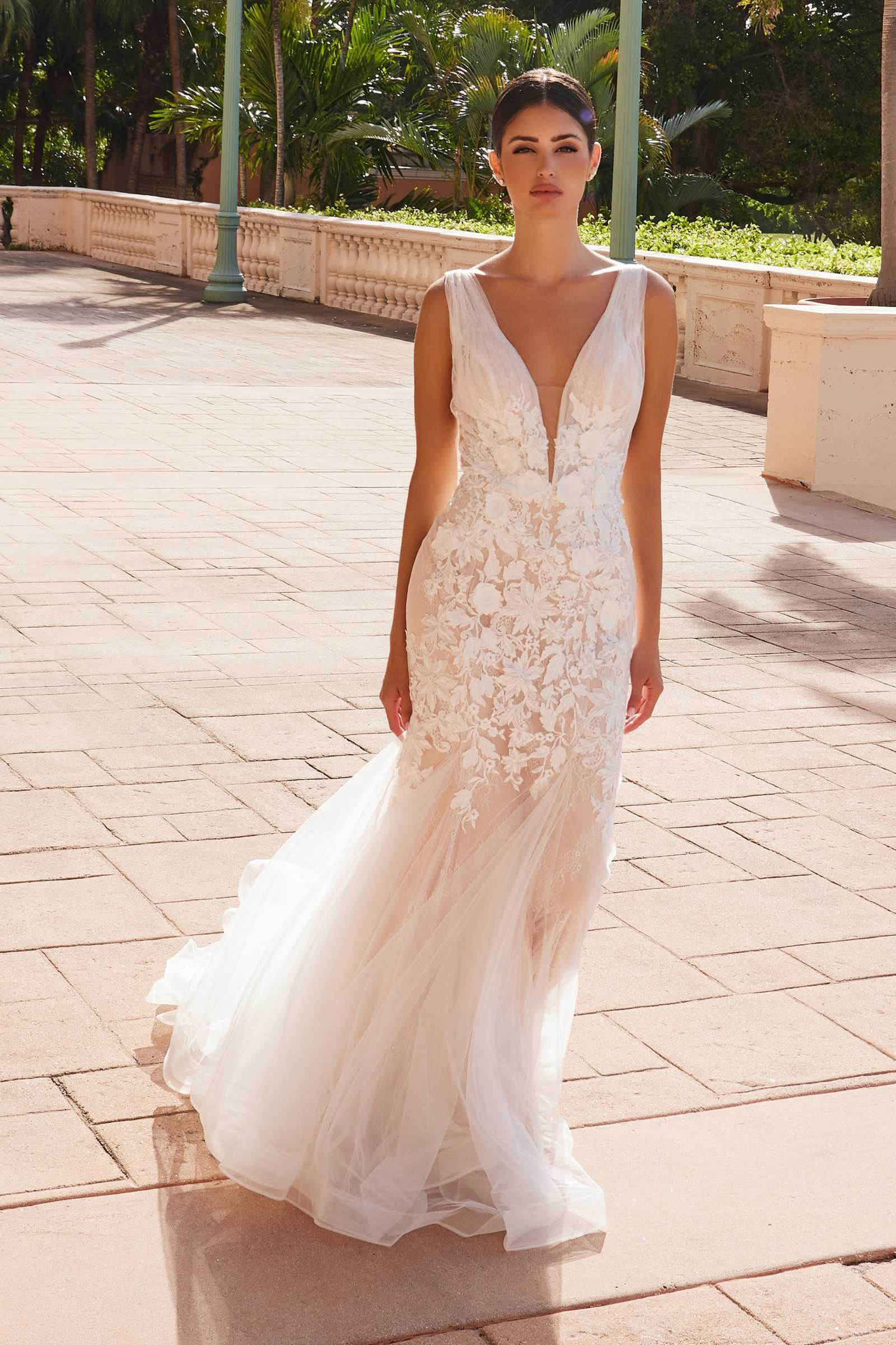 Imagine yourself wearing this stunning floor length wedding gown for your big day! This full-length wedding dress by Nox Anabel JE917 is truly one of a kind! It features a plunging V-Neckline with sheer panel insert, side sheer cut outs and tulle shoulder straps that extend to an open V-back. The dress is fitted with lace and tulle which creates an elegant mermaid look. An ideal long dress for weddings or even debutantes!