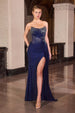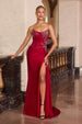 This stunning fitted gown by Ladivine CD689 captivates with its asymmetrical strapless neckline and hand-beaded embellishments that add radiant dimension to the bodice. Crafted from soft stretch satin, the design features delicate ruching that accentuates the waist and a thigh-high slit for a touch of drama. The structured corset-style bodice provides a sculpted silhouette, making it the perfect choice for any high-glamour event.