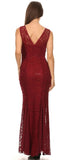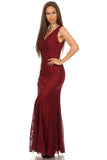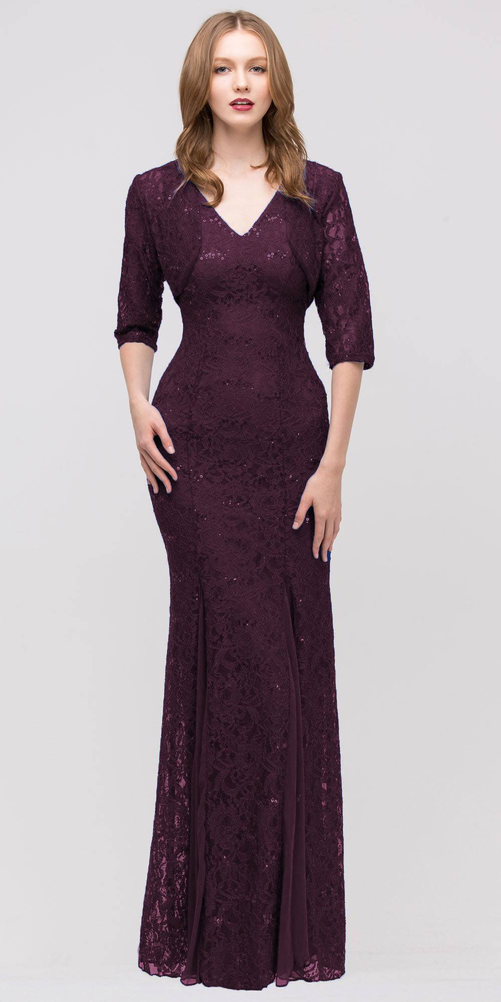 CLEARANCE ITEM - This beautiful top seller slim silhouette mermaid gown in burgundy features a V neckline, sequin embellishments and a flair hem. This dress includes a matching mid length sleeve jacket.