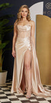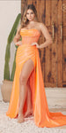 This elegant satin sheath gown by Nox Anabel E1237 features a strapless cowl neckline, with a corset boned bodice and a zipper at the back for a secure fit. The fitted silhouette also includes a floor-length side sash, and a front leg slit for added flair. Effortlessly elegant, this gown is suitable for any formal occasion. An ideal full-length dress for red carpet events, pageant, prom or in any other formal occasions!