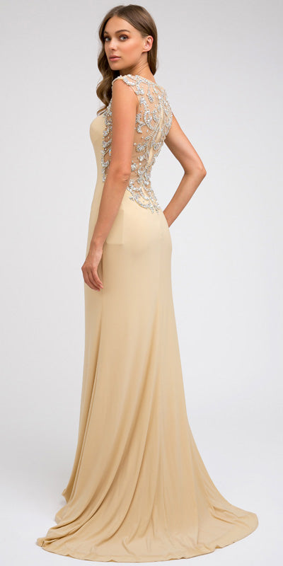 Dress up in this beautiful long formal gown. Made in ITY, this floor length dress has cap sleeves, a bateau illusion neckline and is decorated with sparkly rhinestones in the front and back.