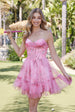 Nox Anabel T207 Fit and Flare Strapless Flower Print Chiffon Dress with Pleated Top, Boned Waistline, Layered Skirt, and Straight Zipper Back