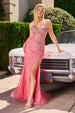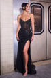 Make a striking entrance in this fitted strapless gown by Ladivine CD727, featuring a deep V-neckline and sheer structured bodice adorned with a linear beaded motif. The shimmering sequin and bead embellishments cascade over a tulle overlay, creating a captivating play of texture and light. Finished with a sultry leg slit and lace-up corset back, it's a bold yet refined choice for prom, black-tie affairs, or elegant evenings.