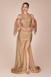 CLEARANCE ITEM - Imagine yourself wearing this stylish long formal stretch luxe jersey gown for your next special event! This sheath floor length formal dress by Ladivine CD943 has an off the shoulder strap and is artfully tucked and ruched to accentuate your curves. This dress features an off the shoulder neckline framed by elongated ties and a floor pooling fishtail hem, which is defined by a dramatic front leg slit.