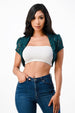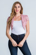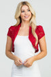 Crochet sequin lace cropped shrug with open front and cap sleeves.