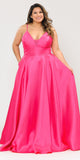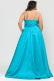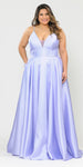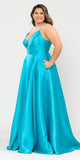 Imagine yourself wearing this beautiful floor length A-line mikado plus size dress by Lindas W1070. This long, A-line dress features a V-neckline with sheer insert panel, side pockets. and a lace up tie back. An ideal full-length dress for prom, special occasion, party or in any other formal occasions!