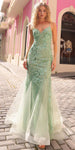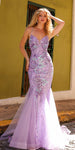 The Nox Anabel C1416 dress features stunning, embroidered sequin applique that adds a touch of elegance to the mermaid silhouette. Its thin spaghetti straps and illusion V-neckline showcase the wearer's beauty, while the fitted bodice hugs the body and the layered tulle skirt creates a formal and eye-catching look. The open strappy lace-up back makes this dress a head turner and showstopper, making it the perfect choice for any special occasion. An ideal full-length dress for black tie, red carpet, prom or in any other formal occasions!
