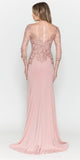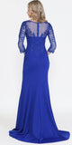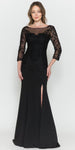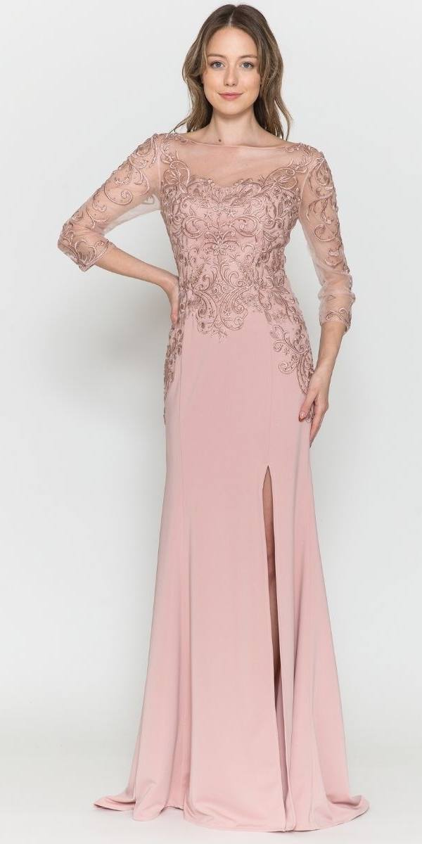 Imagine yourself wearing this beautiful floor length heavy jersey dress by Poly USA | Ed Young 8564. This long mid-length sleeve fitted dress features an embroidered top, bateau illusion neckline, front slit and an open illusion back. A sophisticated and classic attire for wedding events, awards ceremony or any other formal occasions