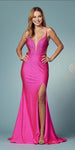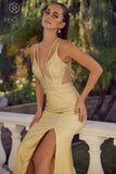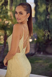 Imagine yourself wearing this gorgeous floor length fitted mermaid gown for your next formal event. This long formal dress by Nox Anabel E1003 features a plunging sweetheart neckline with sheer insert panel side cut outs and spaghetti straps. The dress completely is embellished small bead sparkly beading with criss cross back straps, and a front leg slit. An ideal long dress for red carpet events, pageant, prom or in any other formal occasions!
