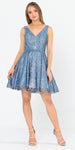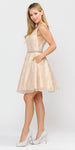 A-line made of patterned metallic lace short party dress by Poly USA | Ed Young 8504. Featuring V-neck and back, sheer cut-out under the arms, beaded waist with side pockets, a pretty outfit for homecoming, graduation or sweet-sixteen parties or in any other special celebrations.