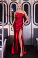• Design: Asymmetric strapless neckline with ruched bodice & thigh-high slit