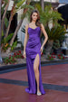 This fitted stretch satin dress by Nox Anabel A1742 features a sculpted silhouette designed to enhance your natural curves. The elegant draped neckline creates soft, flowing folds that add dimension and sophistication. A daring thigh-high slit provides movement and allure, while the lace-up back allows you to adjust the fit to your preference. Crafted from premium stretch satin, this dress combines luxury fabric with flattering construction for an unforgettable look.