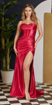 Imagine yourself wearing this long stunning formal evening gown by Nox Anabel E1042 for your next special event!  This dress features a cowl neckline, bustier corset boned bodice and high side slit. An ideal full-length dress for red carpet events, pageant, prom or in any other formal occasions!