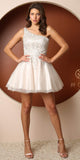 Imagine yourself wearing this short A-line gown for your next special event by Nox Anabel H774. This dress features a one shoulder design, tulle skirt and an embroidered bodice. An ideal short dress for homecoming, damas, prom or in any other formal occasions!