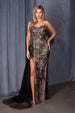 This fitted gown by Andrea & Leo A1489 exudes a captivating allure with its illusion neckline and intricate sequin embroidery layered over a nude mesh base. The shimmering beadwork creates a dramatic, sculpted effect that enhances every curve, while a cascading side tulle drape adds dimension and movement. A hidden back zipper ensures a seamless finish, making this gown an unforgettable choice for black-tie events, galas, or mother of the bride.