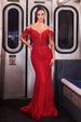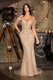 Make an unforgettable entrance in this mermaid gown by Ladivine SF209, designed with an off-the-shoulder neckline adorned in shimmering fringe and linear beading. The crystal and pearl-embellished tulle overlay creates a radiant effect that highlights every curve. Perfect for black-tie events, galas, or the modern mother of the bride seeking refined glamour.