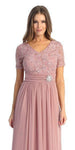 Dress up in this Celavie 6320-S A-line dress which features short sleeves with a lace bodice accented with sequins. This knee length dress also has a V-back and brooch around the waist.