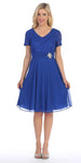 Celavie 6320-S - Knee Length Royal Blue Dress With Short Sleeves Lace Bodice Side View