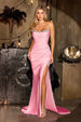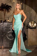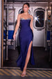 This fitted satin gown by Ladivine CD391 captures timeless allure with its strapless neckline trimmed in sparkling crystal embellishments. Soft ruching along the bodice flatters the figure, while a side drape accentuates the waist before cascading into a smooth, floor-length skirt with a daring thigh-high slit. A blend of sophistication and glamour, this gown is the perfect choice for prom, galas, and formal celebrations.