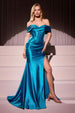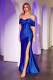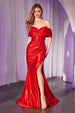 This fitted gown by Ladivine KV1115 dazzles with an off-the-shoulder pleated sweetheart neckline and a boned, structured bodice for exceptional support. Crafted from luxe stretch shimmer glitter satin, it contours beautifully, adding a hint of sparkle to every step. Perfect for prom, galas, or any formal affair, the elegant leg slit adds just the right touch of glamour and allure.