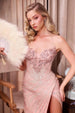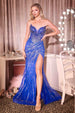 Command attention in this mermaid evening gown by Ladivine KV1138, designed with a strapless sweetheart neckline and a shimmering beaded bodice intricately adorned with crystals and sequins. The sheer corset bodice sculpts the waist, while the fitted skirt glides into a layered glitter tulle train with a daring thigh-high slit. Finished with a lace-up corset back for the perfect fit, this gown is a striking choice for prom, black-tie affairs, and red-carpet events.