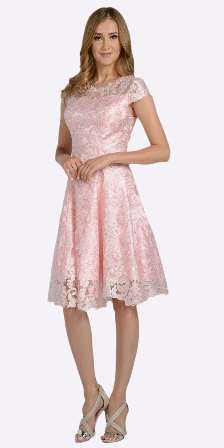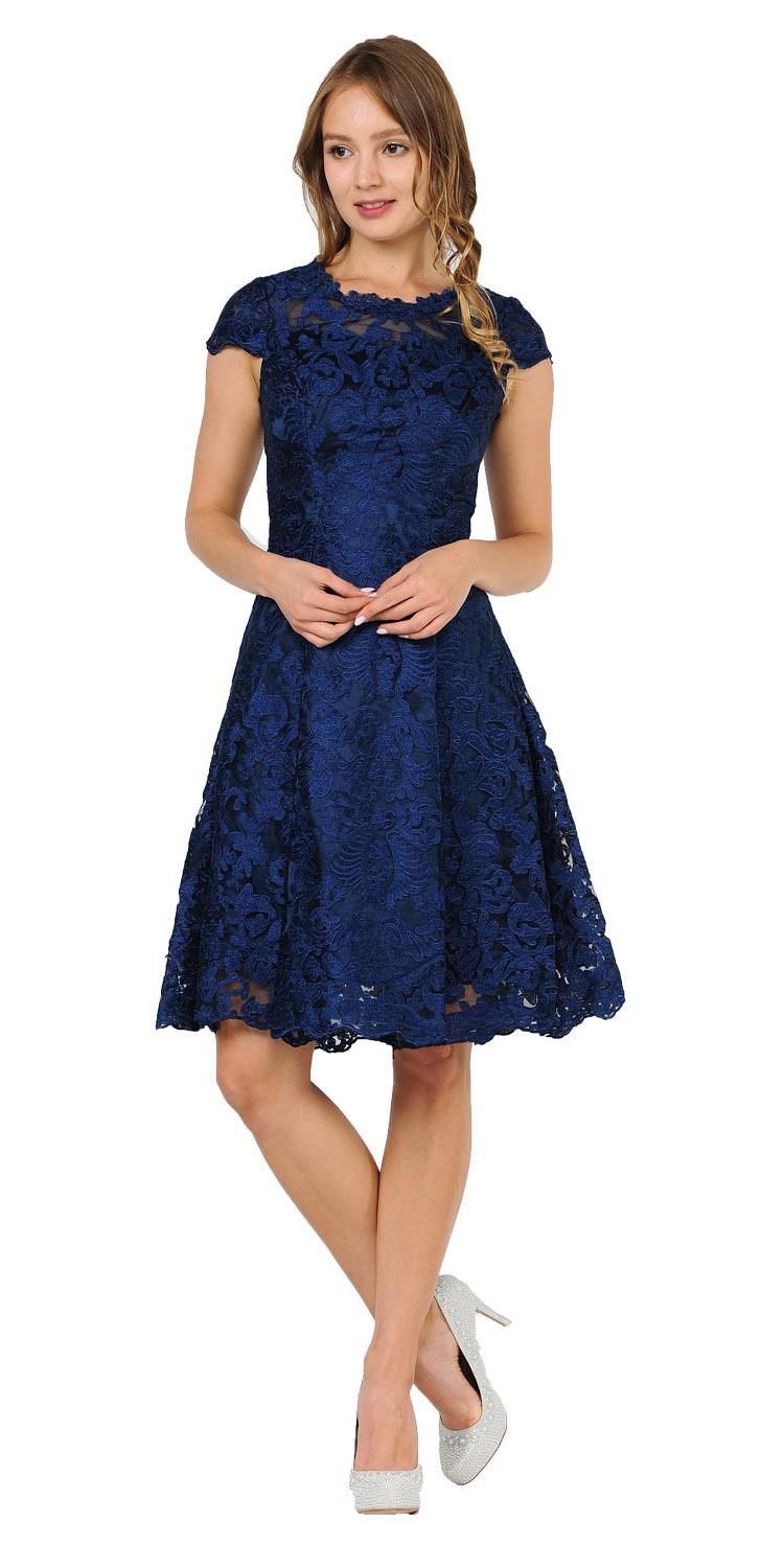 Dress up on your next special occasion with this pretty knee-length A-line dress by Poly USA | Ed Young 8090. A mesh dress with short sleeves adorned with lace appliques.