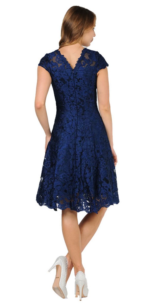 A-line Short Sleeves Appliqued Knee Length Cocktail Dress Navy Blue Back View