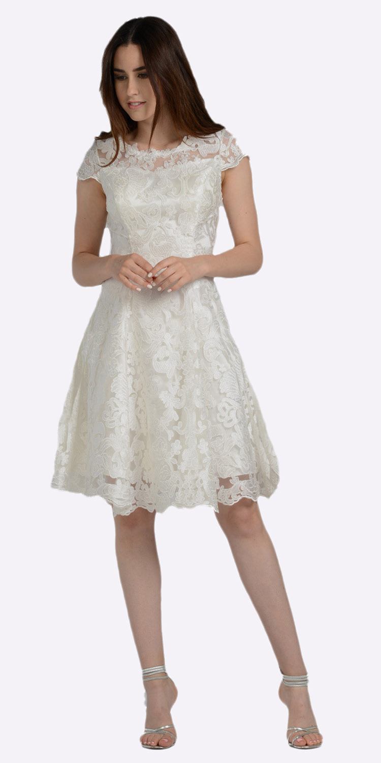 Poly USA | Ed Young 8090 A-line Short Sleeves Appliqued Knee Length Lace Dress
