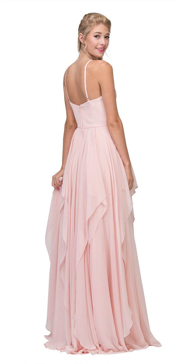 Enjoy the special celebration wearing this a-line floor length dress by Eureka Fashion 6036 in blush. Made of chiffon the bodice is adorned with gold appliques. With spaghetti straps and soft chiffon tiered floor length skirt this halter style dress is an excellent outfit for any formal occasions.