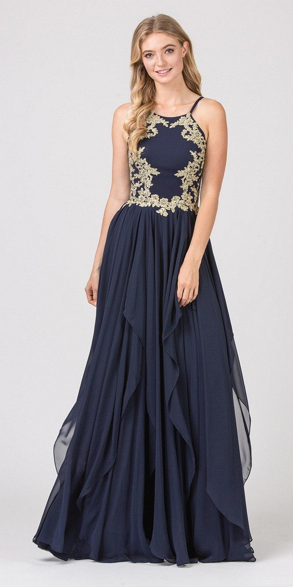 Eureka Fashion 6036 A-line Tiered Long Prom Dress Appliqued Bodice Navy Blue