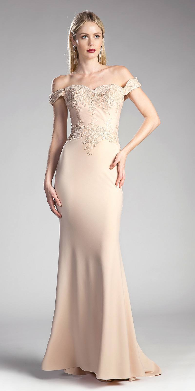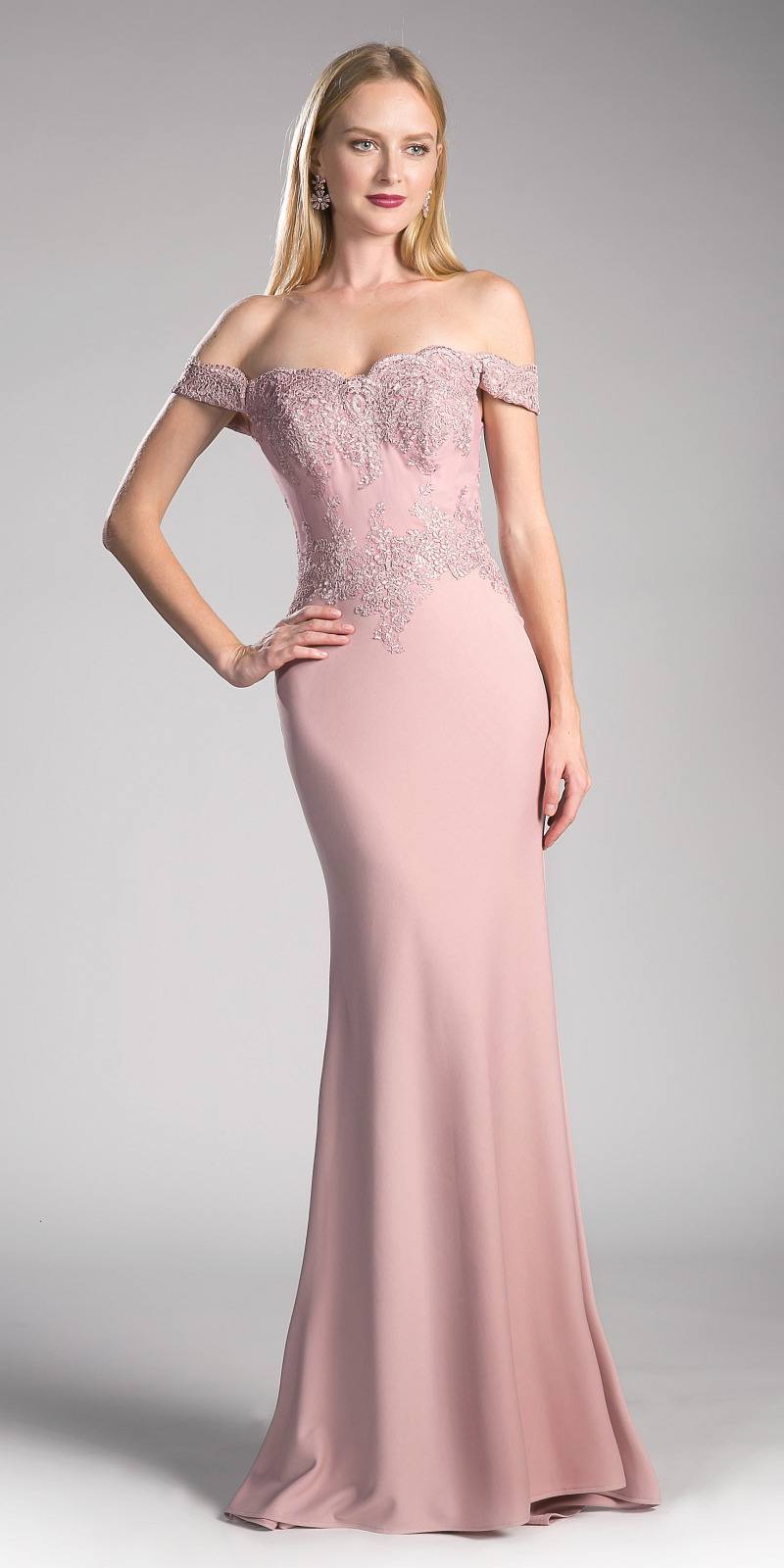 Cinderella Divine CF158 Dusty Rose Off Shoulder Floor Length Evening Gown Applique Bodice