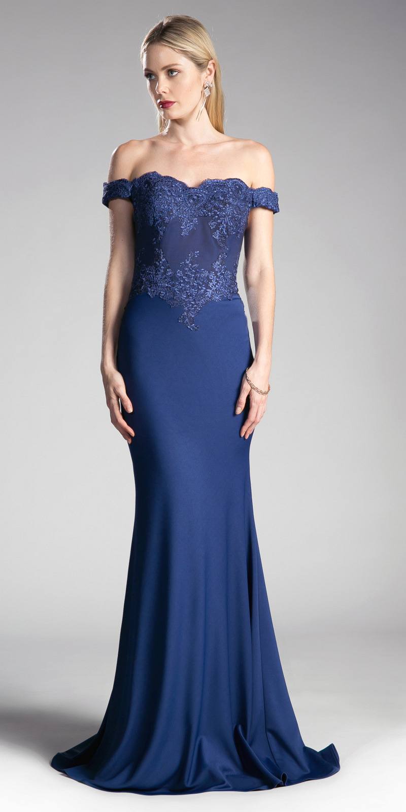 Cinderella Divine CF158 Navy Blue Off Shoulder Floor Length Evening Gown Applique Bodice