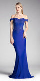 Cinderella Divine CF158 Royal Blue Off Shoulder Floor Length Evening Gown Applique Bodice