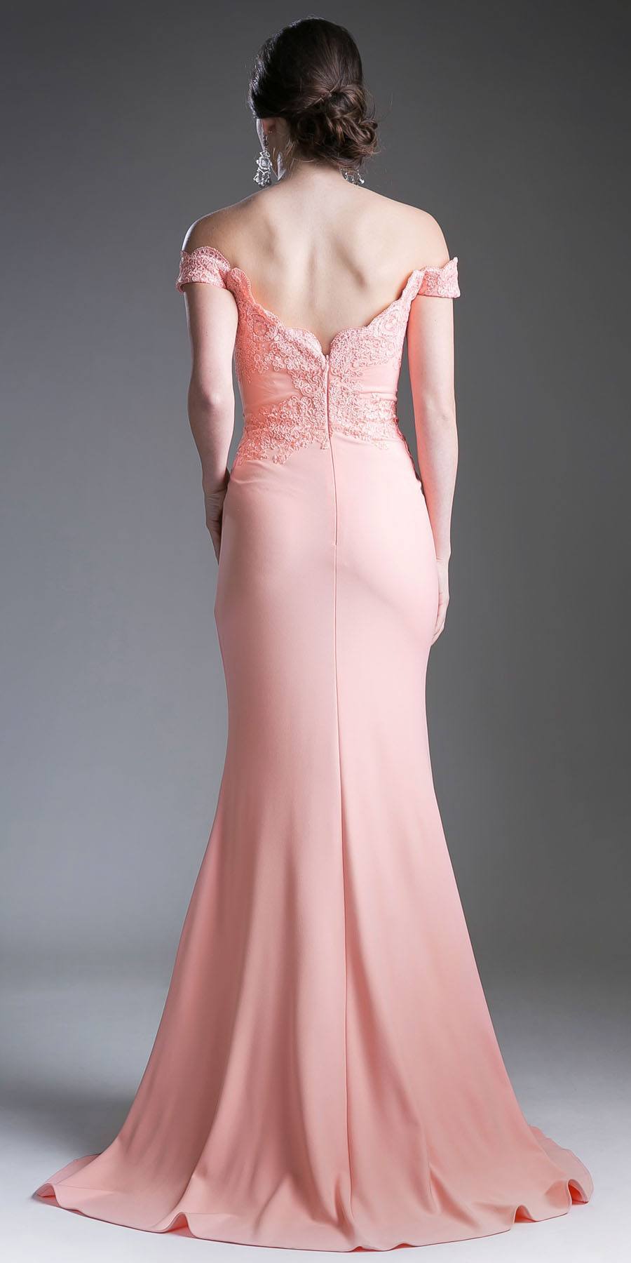 Cinderella Divine CF158 Peach Off Shoulder Floor Length Evening Gown Applique Bodice Back View