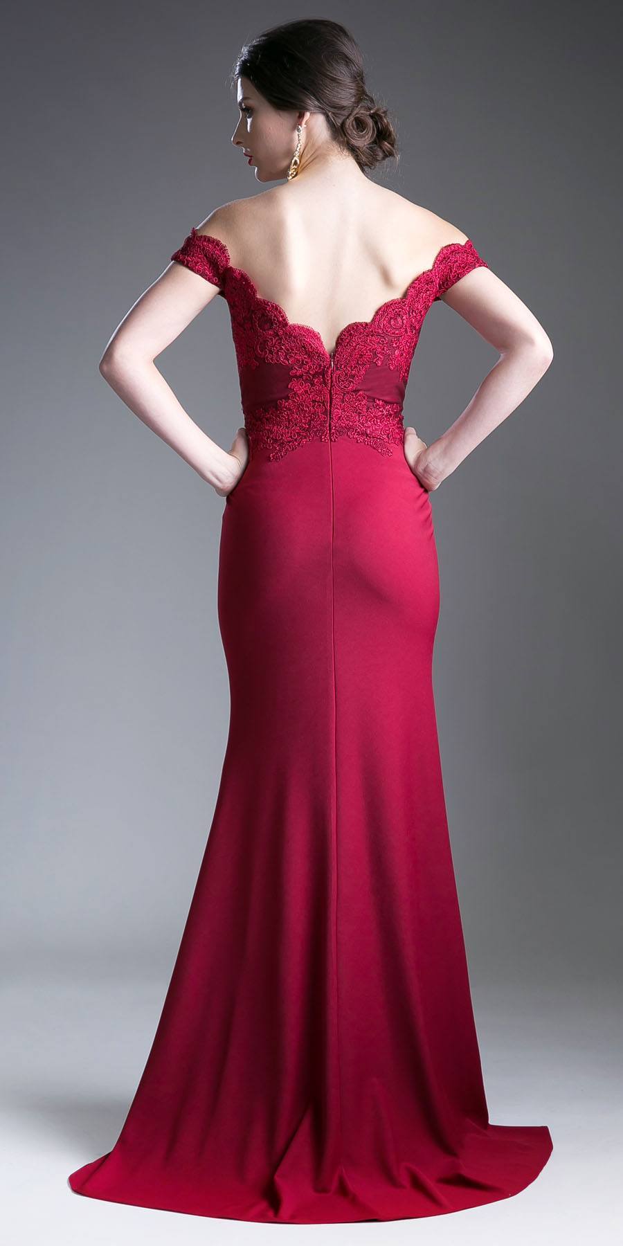 Cinderella Divine CF158 Burgundy Off Shoulder Floor Length Evening Gown Applique Bodice Back View