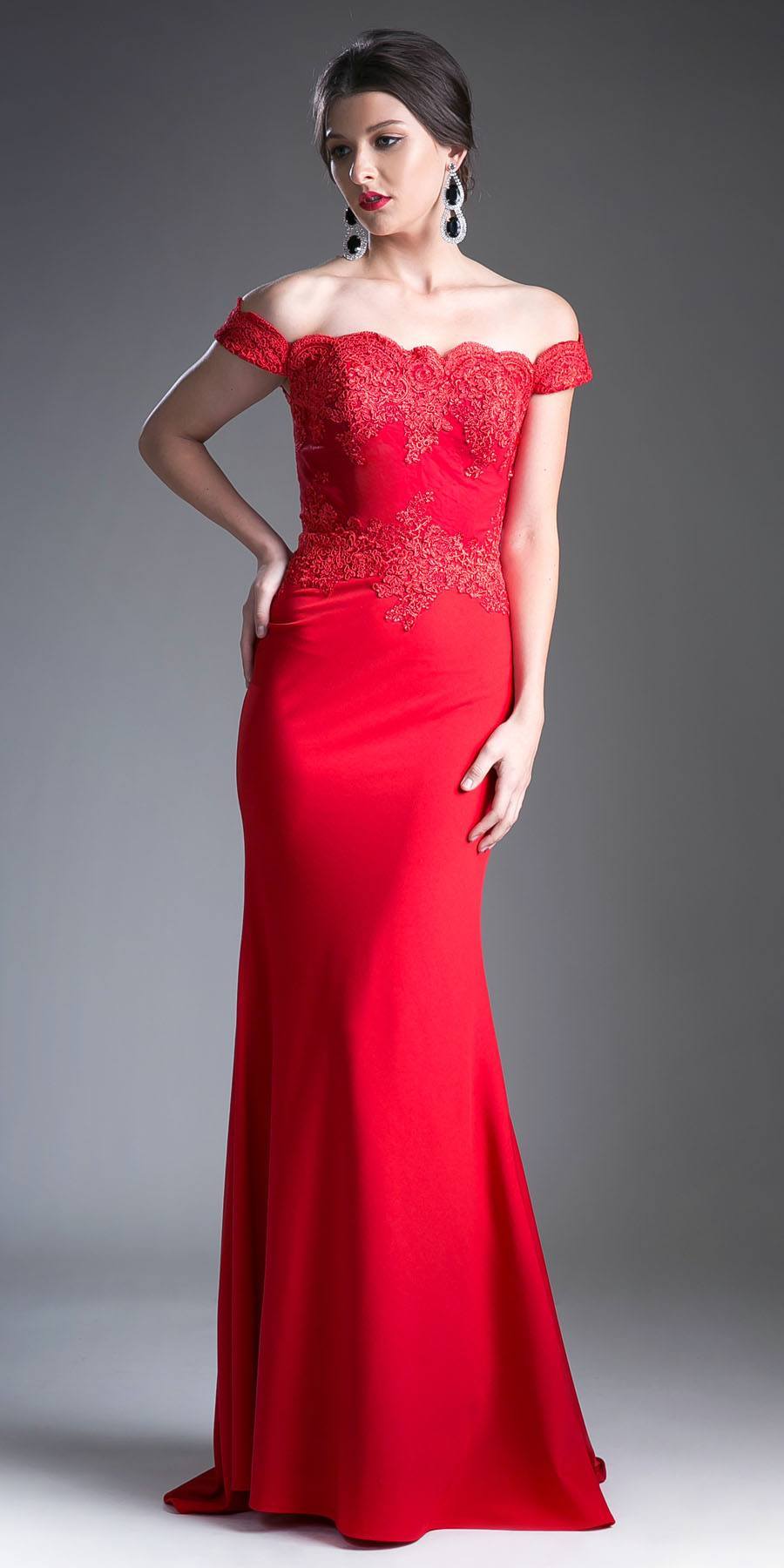 Cinderella Divine CF158 Red Off Shoulder Floor Length Evening Gown Applique Bodice